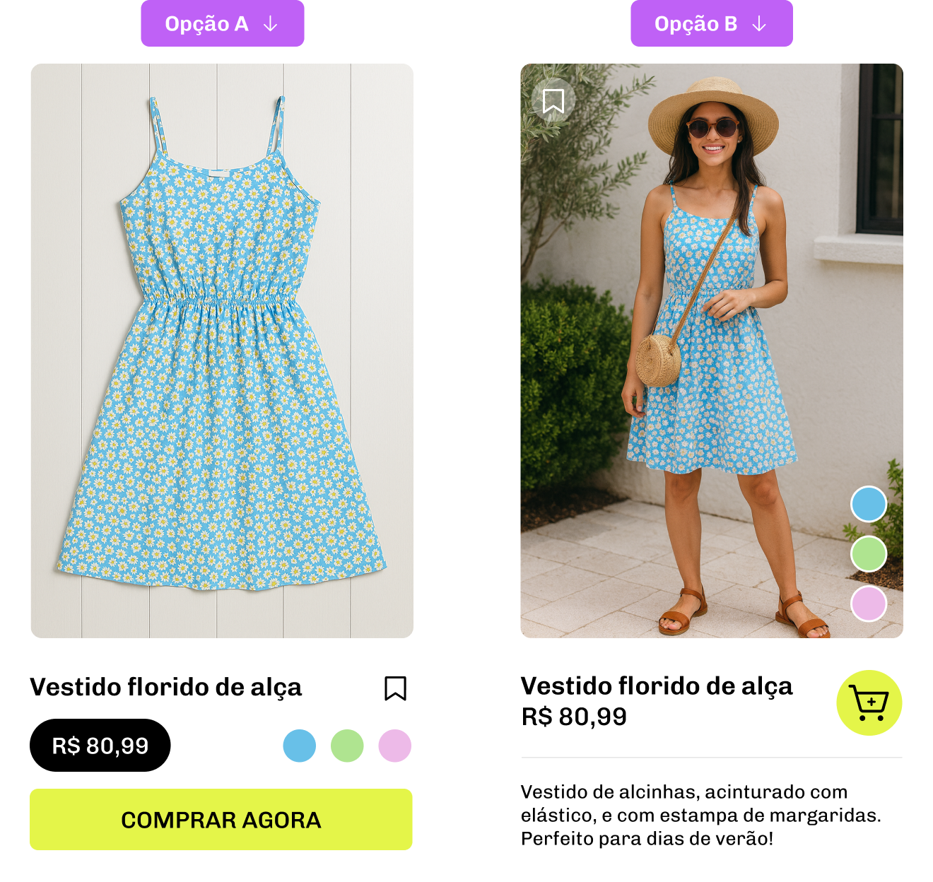 Ambas as opções mostram o mesmo produto, mas cada detalhe pode impactar a percepção do cliente e, consequentemente, a taxa de conversão.